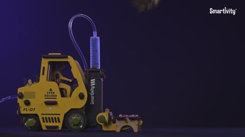 Made for the builders of tomorrow! Make your own hydraulic-powered industrial truck that comes with a pallet and a box.